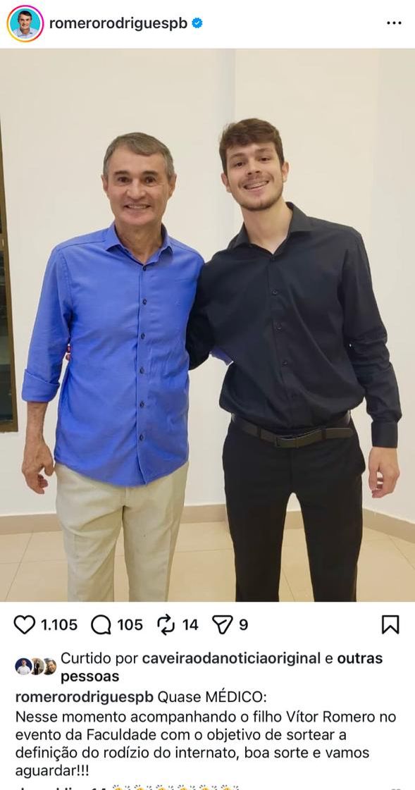 O deputado federal Romero Rodrigues (Podemos) tem sido especulado como possível candidato a vice-governador na chapa a ser encabeçada pelo prefeito Cícero Lucena (MDB). Com indiscutível aceitação eleitoral em Campina Grande e uma reeleição praticamente garantida, Romero resiste à tentação. Mas todas as vezes que o tema da vice vem à tona o nome de um jovem, Vitor Romero, aparece na conversa. Filho de Romero e estudante de Medicina, o jovem seria o dono da cadeira do pai em Brasília, caso o deputado desistisse da reeleição. Para protesto dos aliados, claro. De uma forma ou de outra, não se espante se começar a vir o jovem em questão com mais espaços midiáticos ao lado do pai.